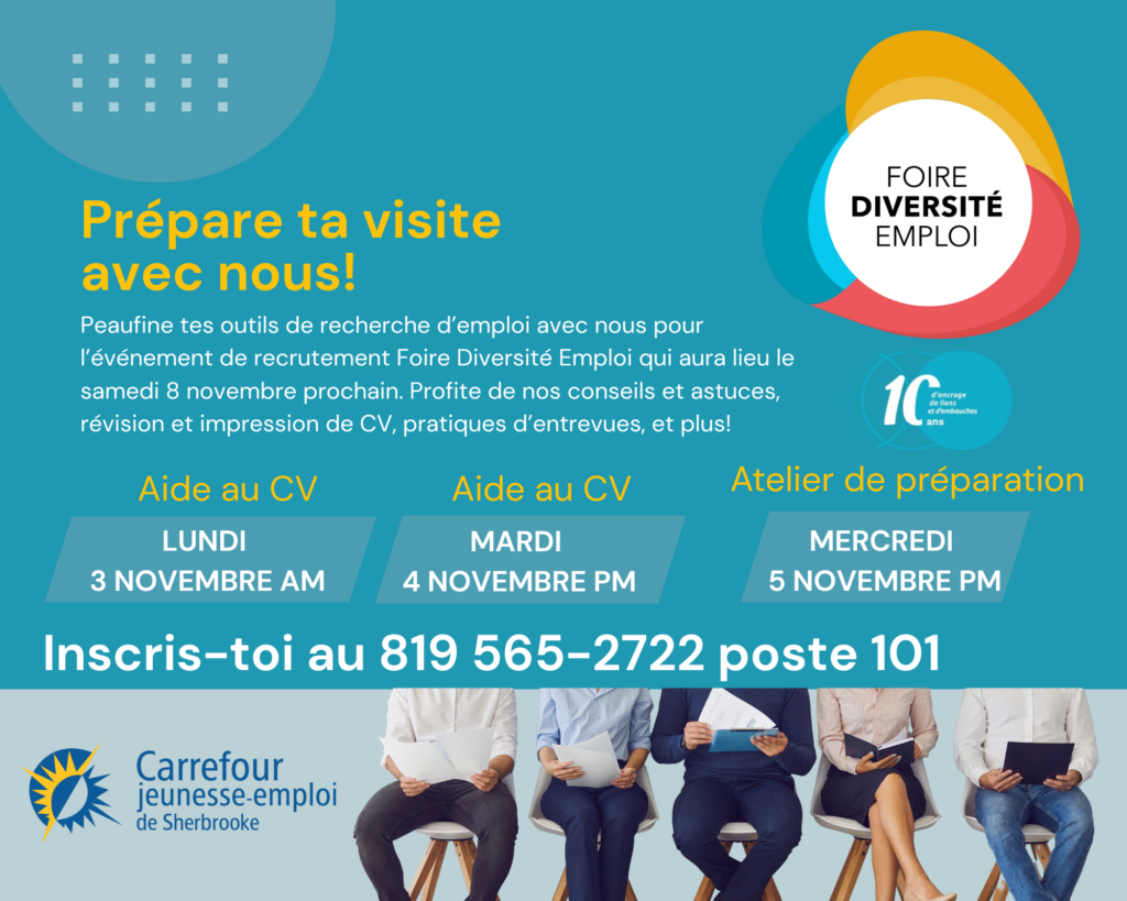 À l’occasion de la Foire Diversité Emploi du 8 novembre prochain, l’équipe du CJE de Sherbrooke te propose de venir dans nos locaux pendant nos heures de service sans rendez-vous pour mettre à jour ton CV! Formule premiers arrivés, premiers servis!